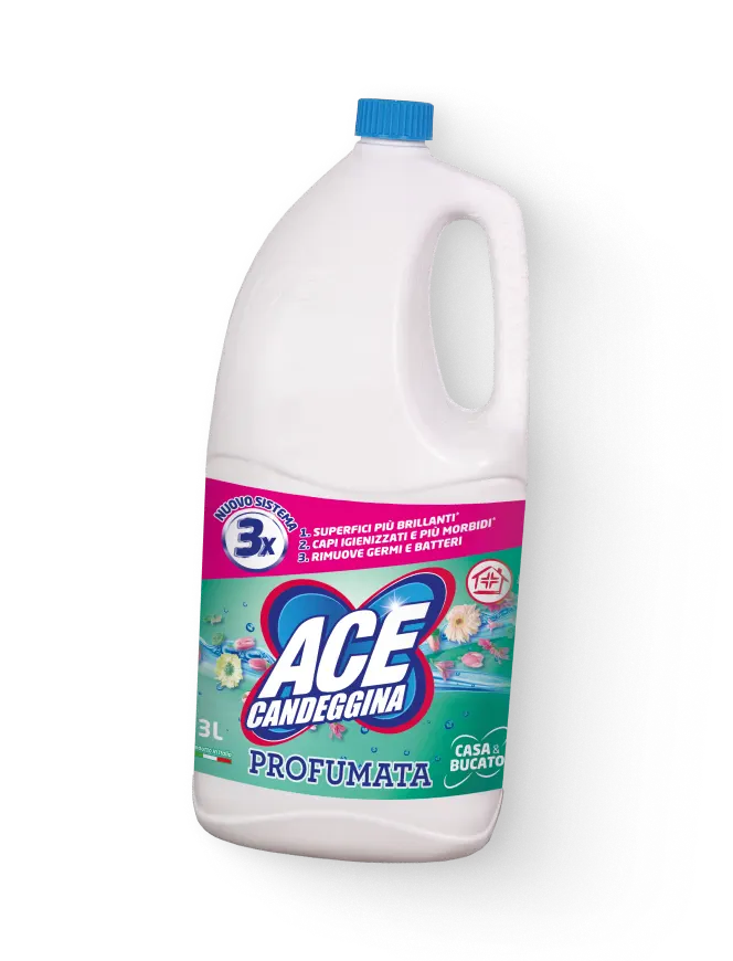 ACE Scented Bleach ist die Nr. 1 unter den Bleichmitteln in Italien° mit blumigem Duft, jetzt mit dem NEUEN 3X SYSTEM, das entwickelt wurde, um eine noch vollständigere Reinigung zu gewährleisten: hellere Oberflächen*, desinfizierte und weichere Kleidungsstücke* und entfernt Keime und Bakterien.