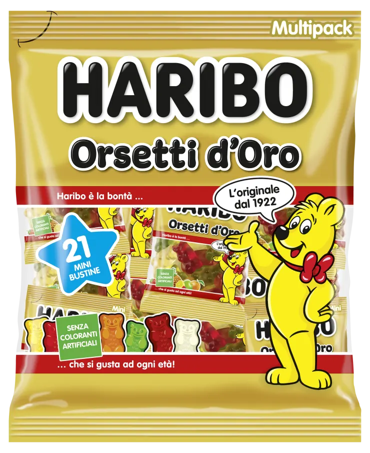 In dieser einen Tasche befindet sich ein wahrhaft köstlicher Schatz … das Fruchtherz der einzigartigen und unvergleichlichen Goldbären, umgeben von vielen Mini-Umschlägen! Mit 6 Geschmacksrichtungen, darunter Erdbeere, Orange, Himbeere, Apfel, Ananas und Zitrone, sind die Protagonisten der Familie Haribo die wahren Partylöcher. Dank ihres praktischen Formats eignen sie sich ideal für die Verteilung auf jeder Party und machen Jung und Alt glücklich.