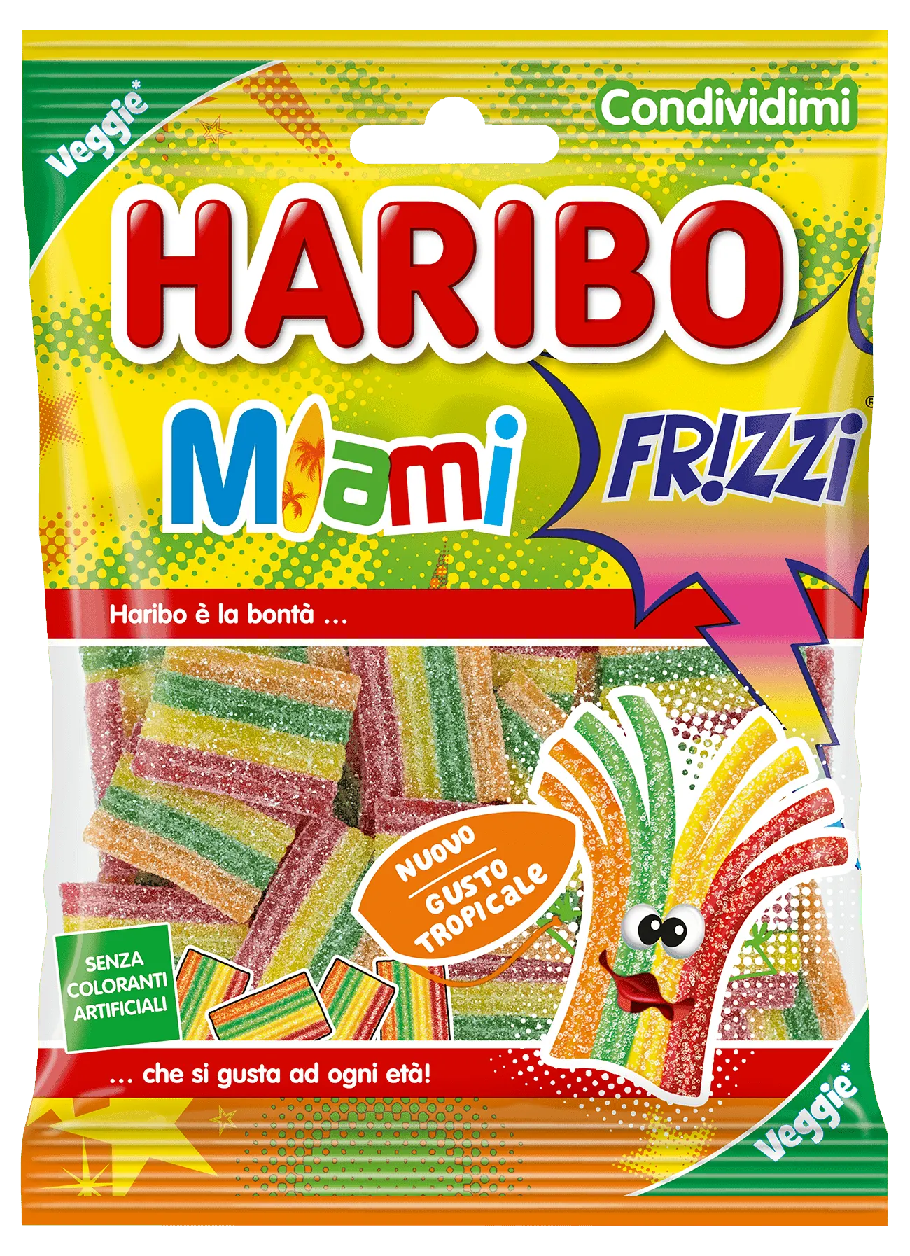 Träumen Sie von einem Urlaub fernab des Stresses der Stadt? Versuche, die Augen zu schließen, während du den neuen tropischen Geschmack von Miami Frizzi genießt. Du wirst auf dieser exotischen Insel nicht surfen, aber der Sprudel der Fruchtaromen, die aus deinem Mund strömen, kann dich Biss für Biss umdrehen.