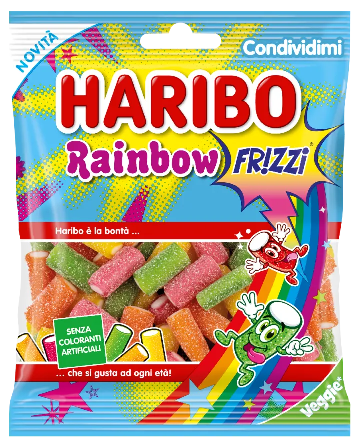 Die neuen funkelnden Regenbögen von HARIBO! Der Rainbow Frizzi begeistert alle mit seiner einzigartigen Textur und einer überraschenden Beschichtung, die den gesamten Geschmack der Früchte freisetzt. Eine überwältigende Vielfalt an Farben und Geschmäckern für ein funkelndes und unwiderstehliches Erlebnis.