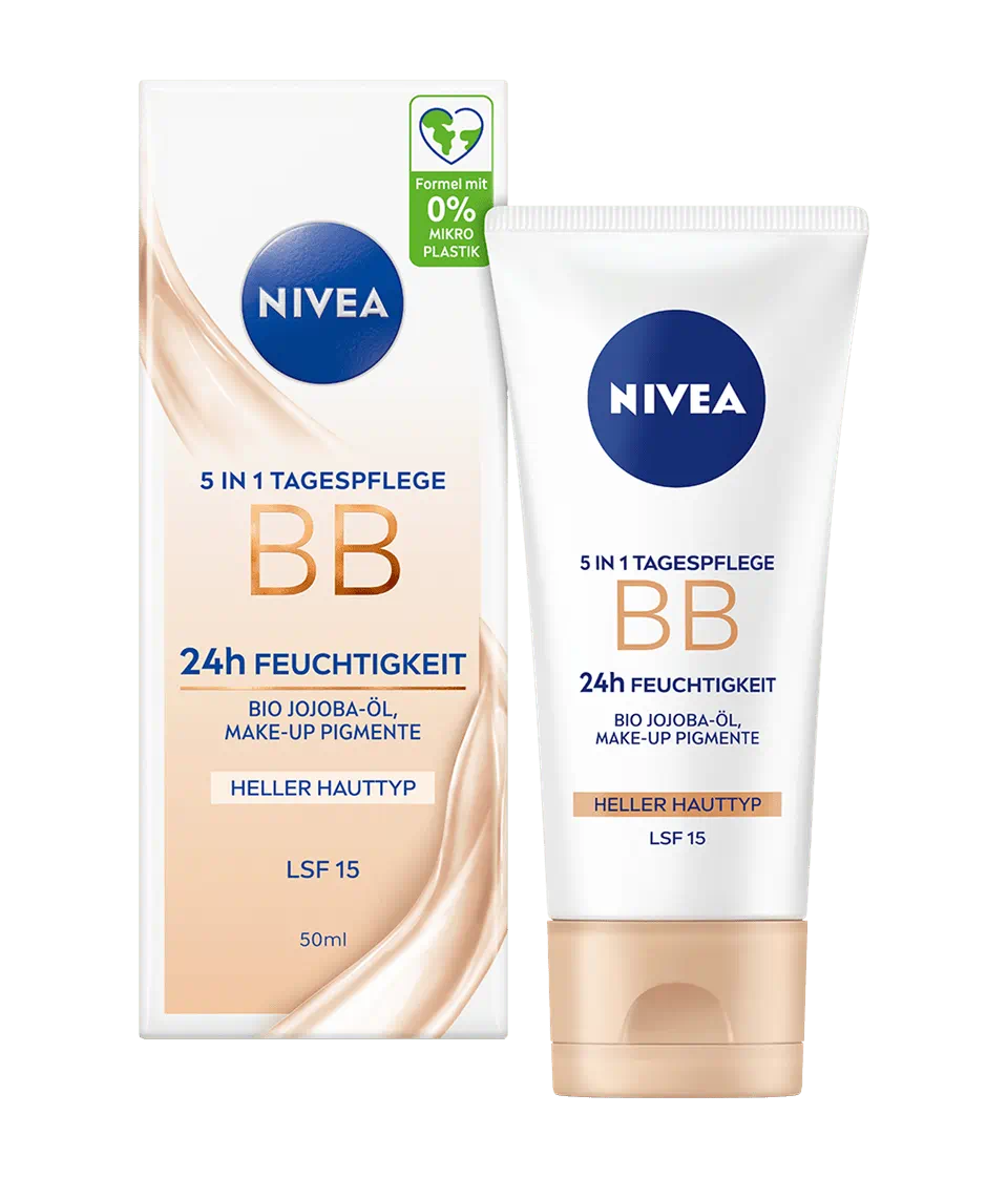 Die NIVEA 5in1 Tagespflege BB 24h Feuchtigkeit Hell ist ideal für helle Hauttypen geeignet. Sie deckt kleine Schönheitsmakel, wie Anzeichen von Müdigkeit, rötliche Partien und kleine Fältchen ab und schützt die Haut vor lichtbedingter Hautalterung mit LSF 15.