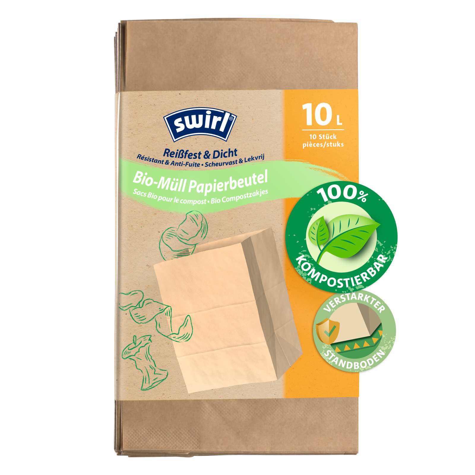 Der Swirl® Bio-Müll-Papierbeutel hält dicht, ganz gleich ob du ihn mit trockenen oder feuchten Resten konfrontierst. Dank veredeltem Nassfest-Papier ist unser Bio-Müllbeutel reißfest während der verstärkte Standboden dicht hält und für viel Platz sorgt. Der Bio-Müllbeutel mit einem Fassungsvermögen von 10 Litern ist zu 100% kompostierbar und damit für die Biotonne geeignet. Eine prima Lösung – für dich und für die Umwelt!
