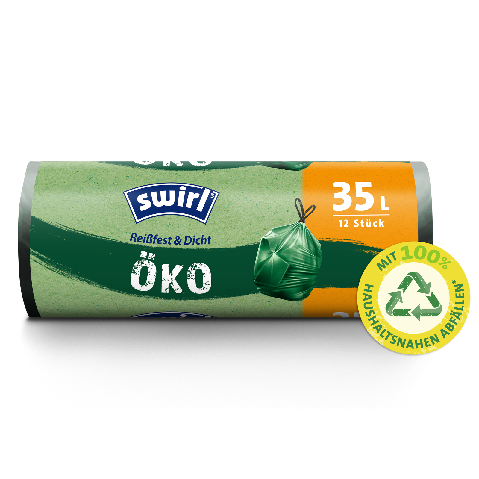 Die Swirl® Öko-Müllbeutel bestehen zu 100% aus recyceltem Plastik*, welches aus haushaltsnahen Abfällen (zum Beispiel gelbe Tonne / Sack) stammt. Wie andere Swirl® Müllbeutel bieten auch sie die gleiche bewährte Reißfestigkeit und Tropfsicherheit. Dank praktischem Zugband lassen sie sich leicht verschließen und besonders gut tragen.