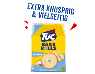 Bake Rolls stehen für eine einzigartige Kombination aus fein geschnittenem, doppelt gebackenem Brot und verschiedenen Gewürzen. Mit ihrem intensiv-köstlichen Geschmack und ihrer extra knusprigen Textur kann man ihnen einfach nicht widerstehen! TUC Bake Rolls gibt es in vielen verschiedenen, immer unwiderstehlichen Sorten. Der perfekte Knabber-Snack zum Teilen oder Selbergenießen.