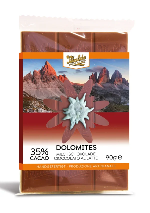 Milchschokolade. Zutaten: Zucker, Kakaobutter, Vollmilchpulver, Kakaobohnen, Emulgator (Sonnenblumenlecithin, E476), Vanille Naturextrakt. Kann Spuren von Schalenfrüchten und Eiproteine enthalten. Kakao: 35% mindestens im Schokoladenanteil.