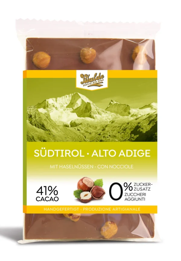 MILCHSCHOKOLADE MIT SÜSSUNGSMITTEL UND HASELNÜSSEN (mindestens 41% Kakao, nur reine Kakaobutter). Zutaten: Süßstoff : Maltitol, Kakaobutter, Vollmilchpulver, Kakaobohnen, Haselnüsse 12%, Emulgator (Sonnenblumenlecithin, E476), Vanille Naturextrakt. Eiproteine und Gluten können vorhanden sein. Ein übermäßiger Konsum kann laxative Effekte haben.