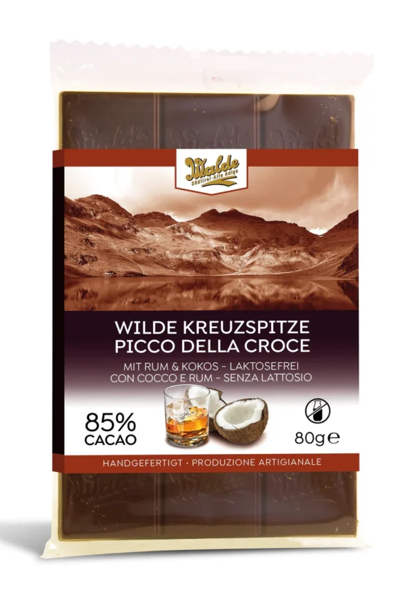 Schokolade mit Rum-Kokos. Zutaten: Kakaobohnen, Zucker, Kakaobutter, Rumzucker 9% (Zucker, Rum 18%, Aroma), Kokosflocken 5%, Schwefeldioxid, Emulgator: (Sonnenblumenlecithin, E476), Vanille Naturextrakt. Kakao: 85% mindestens im Schokoladenanteil.
